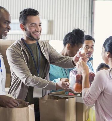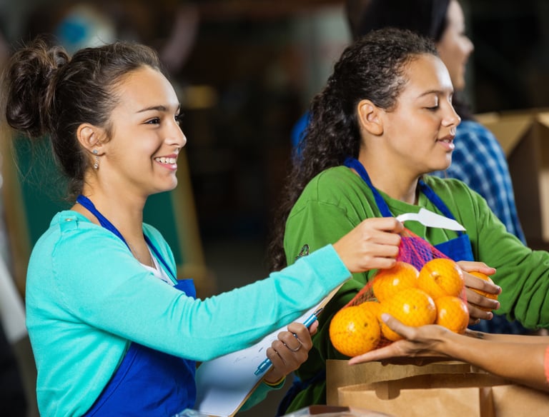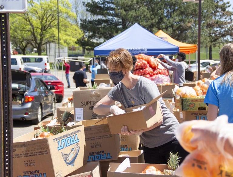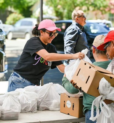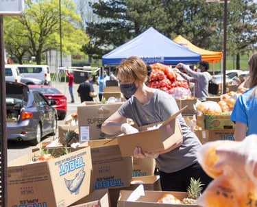 Organizing donations and preparing food kits with care.